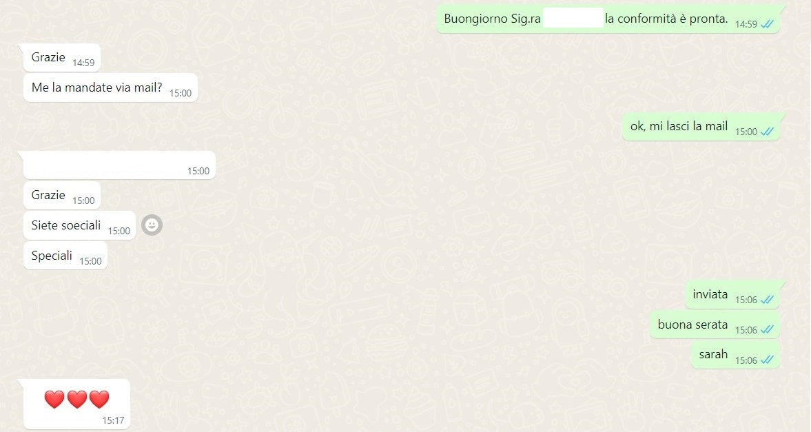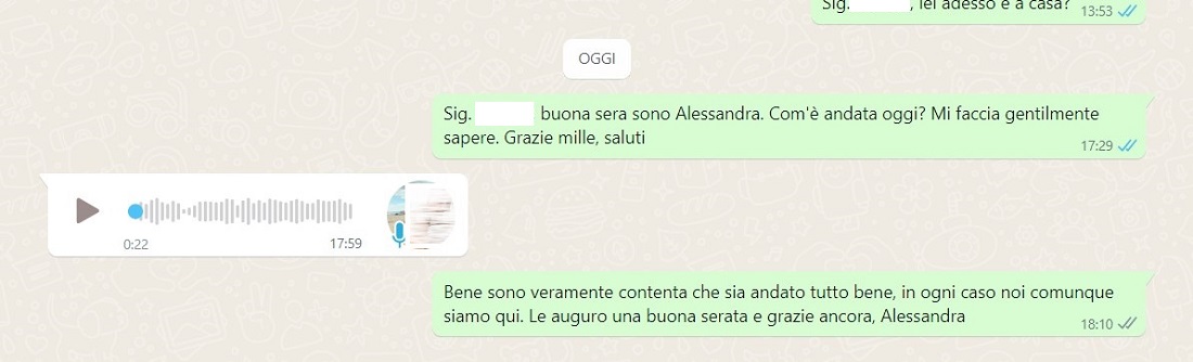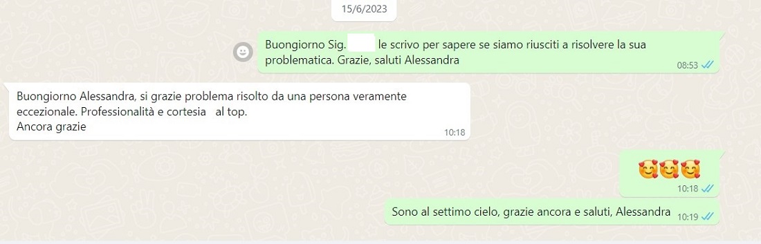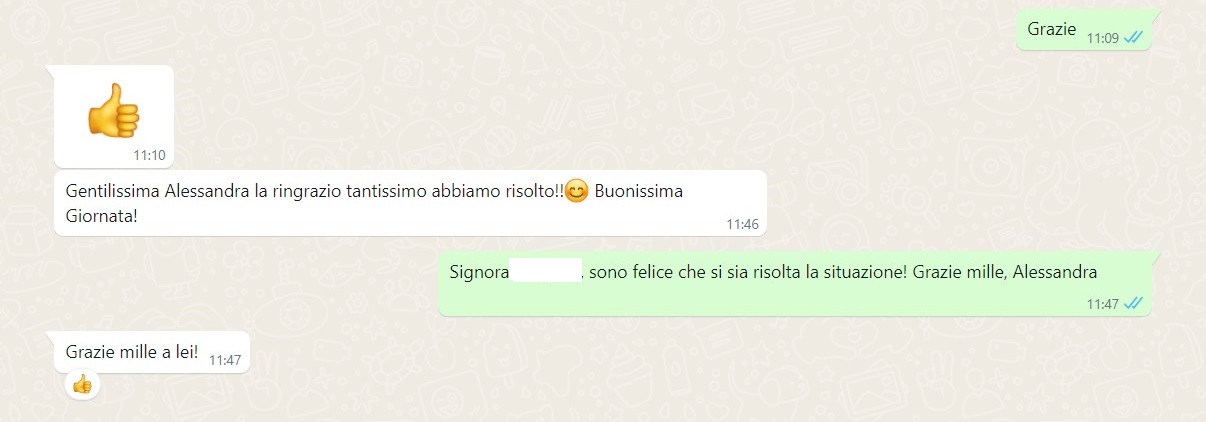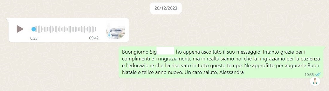 Buongiorno, ho appena ascoltato il suo messaggio. Intanto grazie per i complimenti e i ringraziamenti, ma in realtà siamo noi che la ringraziamo per la pazienza e l’educazione che ha riservato in tutto questo tempo. Ne approfitto per augurarle Buon Natale e felice anno nuovo. Un caro saluto, Alessandra