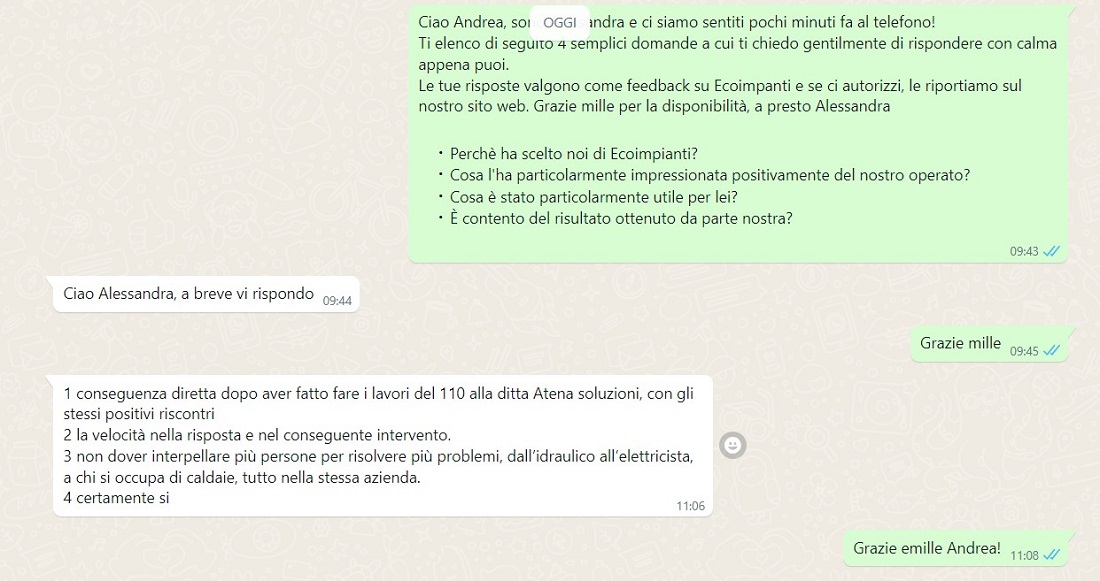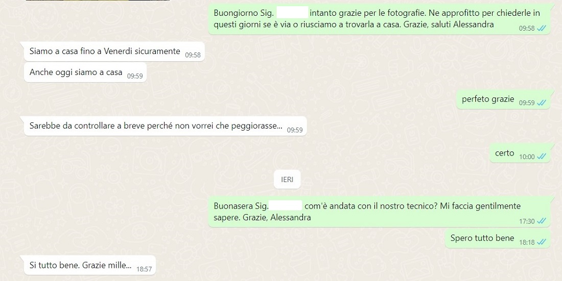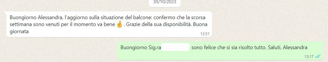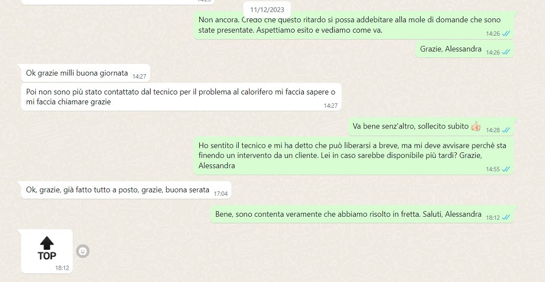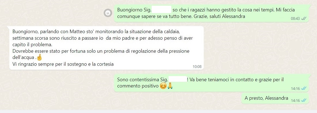 Mi sono trovata molto bene, soprattutto per quanto riguarda gli idraulici, perché ci sono stati problemi di alcuni passaggi, ma discutendone insieme abbiamo risolto tutto in maniera egregia in modo pulito, efficace ed efficiente.